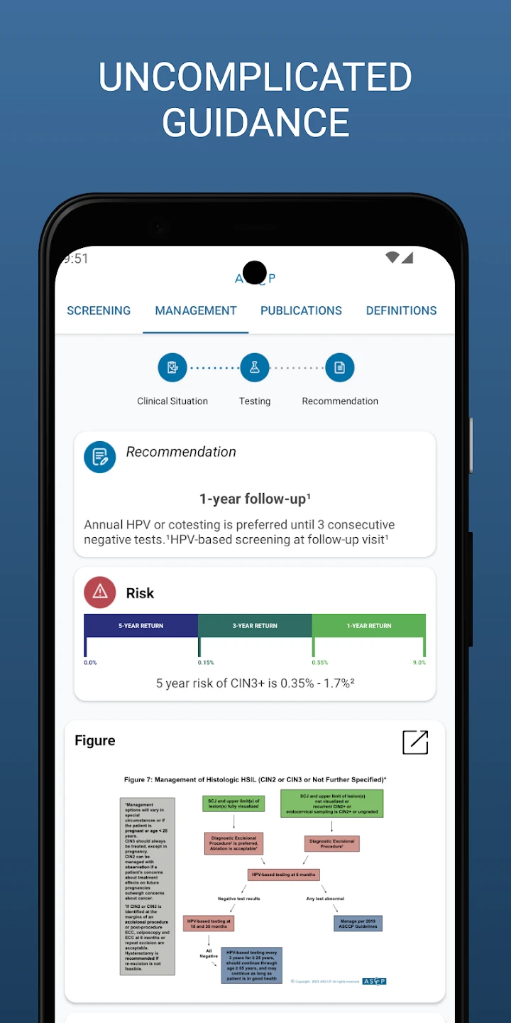 - Latest Version Synchronization: The app checks and updates itself when new official ASCCP Management Guidelines are published, ensuring users always have the most current clinical recommendations at their fingertips, eliminating the need to manually seek out updates.