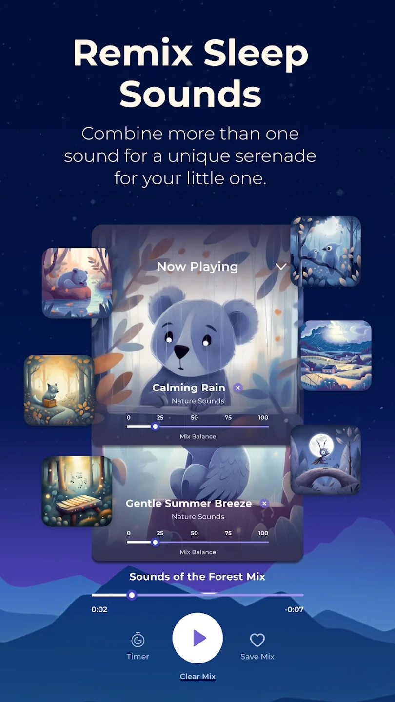 • Custom Playlists: Users can mix and match sounds and stories to create personalized sleep combinations for different situations, from naps to night-time wind-downs. This customization empowers parents to address their child’s evolving sleep needs as they grow, offering long-term value beyond the initial stages.