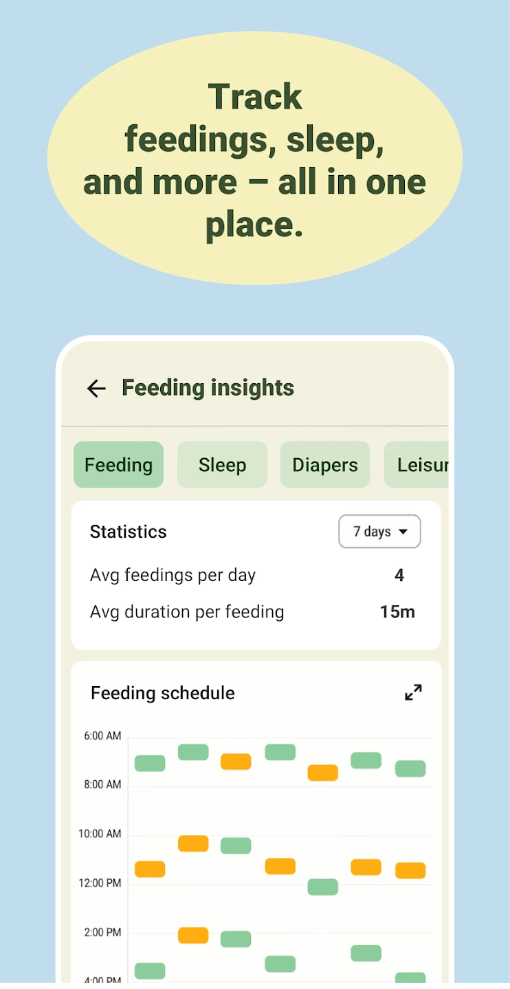 • Visual Timeline Display: The app presents a graphical timeline showing all recorded feeding sessions and sleep periods. This visual aid helps parents quickly grasp daily patterns, spot trends like increasing sleep duration, and understand the overall rhythm without scrolling through raw data.