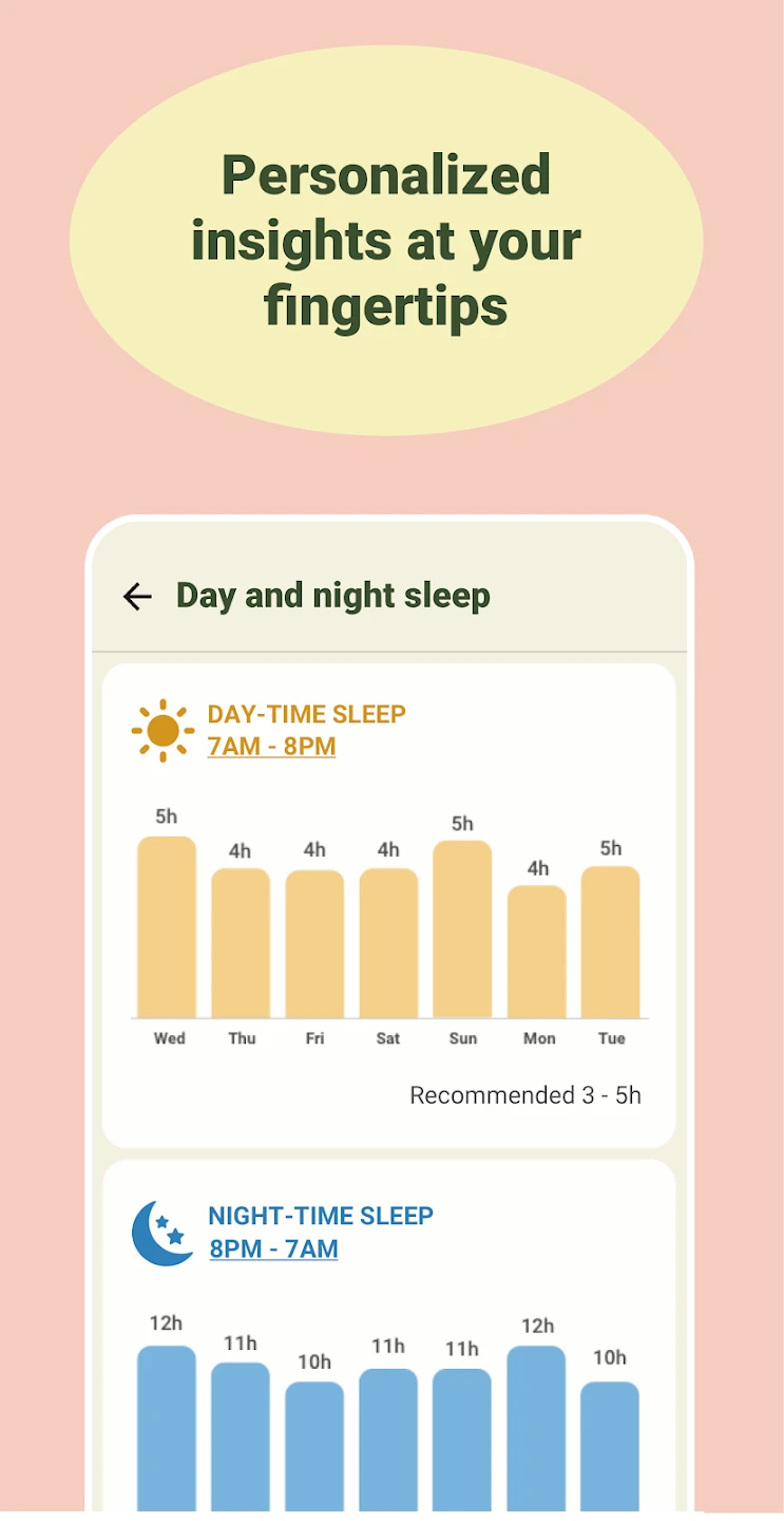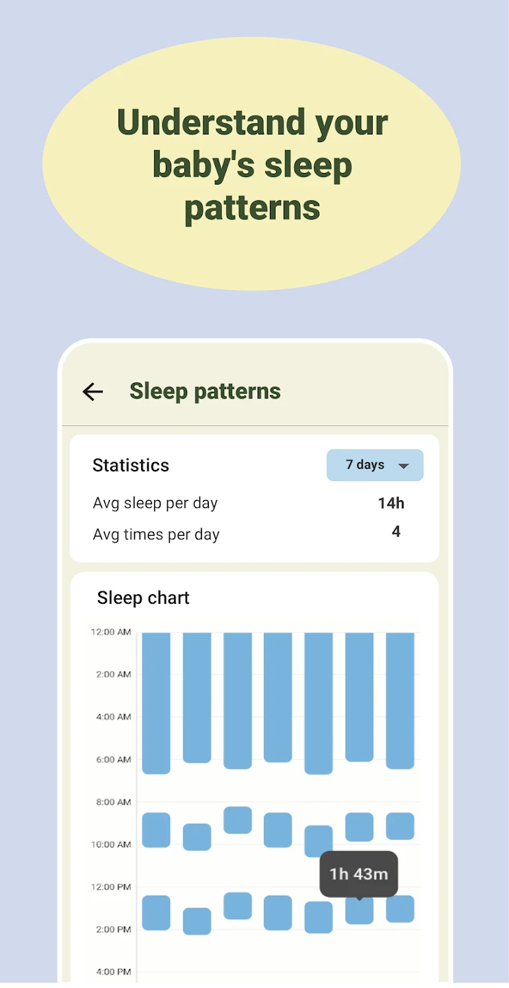 • Simple Statistics and Reports: The app can aggregate data to provide basic statistics on sleep duration per night or feeding frequency during the day. These simple reports offer insights at a glance, potentially revealing sleep regressions or changes in feeding patterns that might require attention without needing complex data analysis tools.