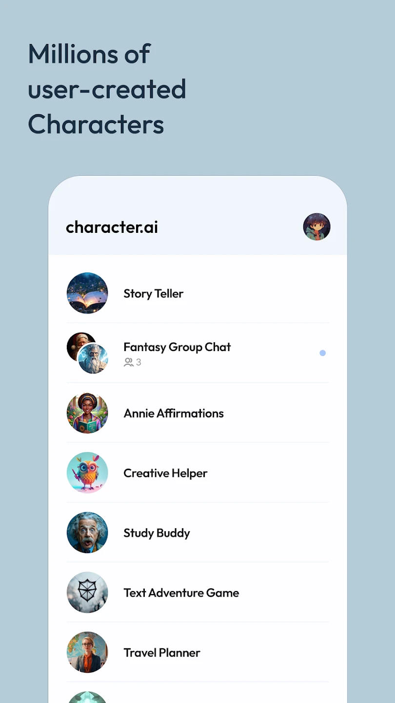 Character AI: Chat, Talk, Text is a mobile application designed for immersive conversational AI interactions, enabling users to chat with diverse virtual characters across various platforms and contexts. It offers text-based communication with AI personalities, making conversations engaging, educational, or entertaining. This app is perfect for writers seeking inspiration, social learners wanting new connections, or anyone curious about AI-powered dialogues.