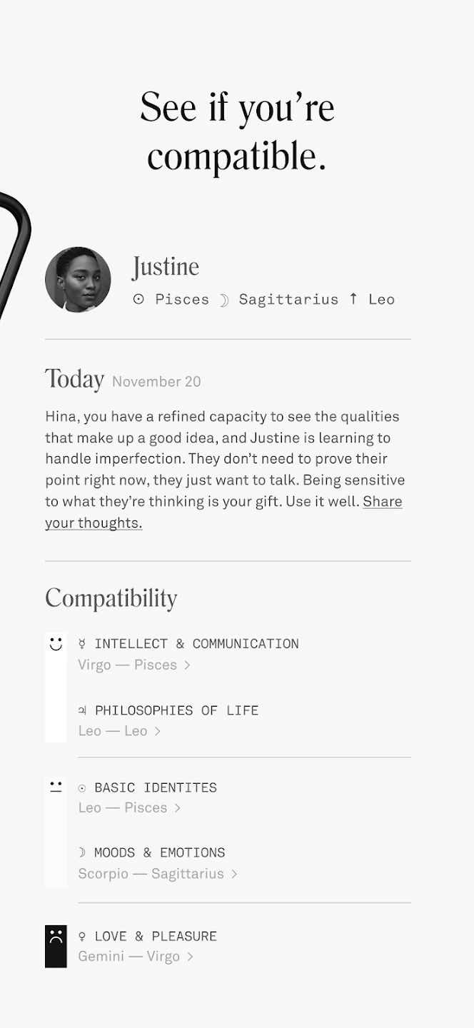 The core appeal of Co–Star Personalized Astrology lies in translating complex astrological data into accessible, actionable insights for relationship dynamics. Its practical usage involves understanding partners’ influences, navigating challenges, and identifying areas of harmony, offering users a unique tool for self-reflection and relationship enhancement within the realm of astrology.