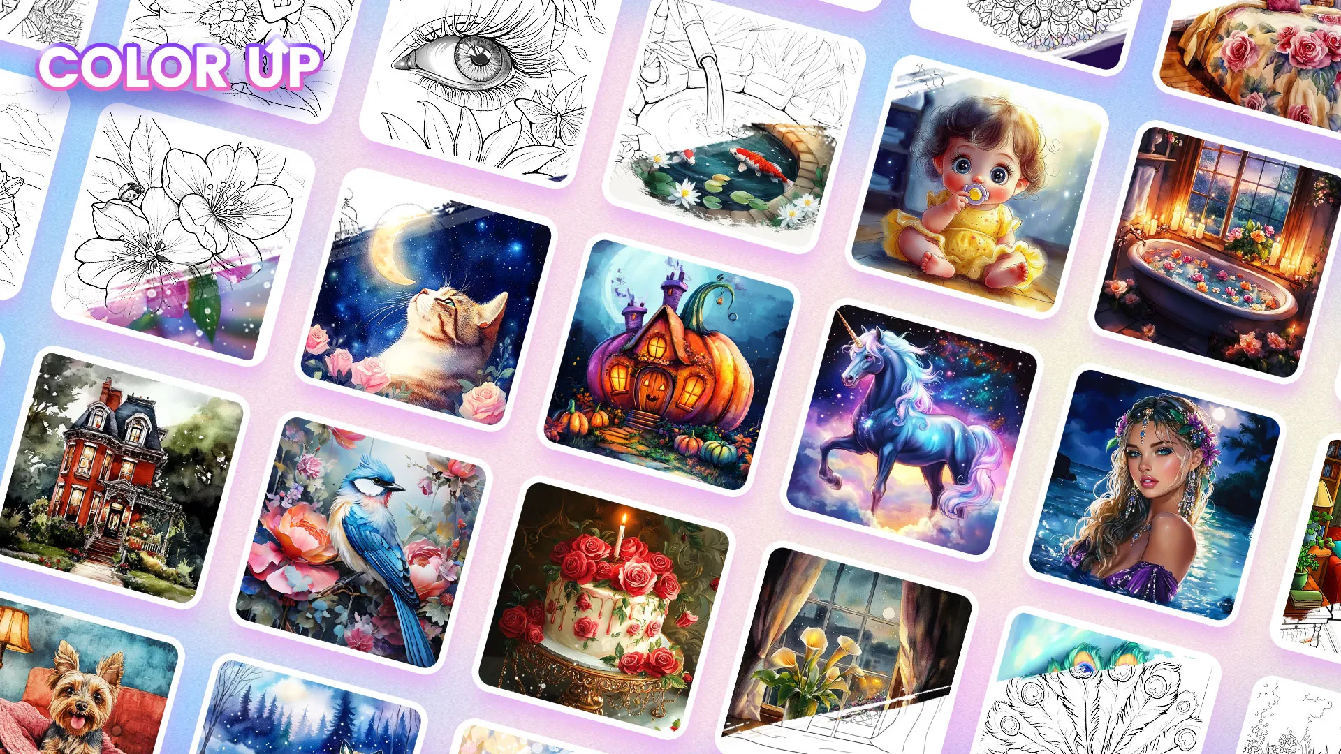 - Visuals or Art Style: The graphics boast a charming, hand-painted art style with a pastel color palette and detailed illustrations ranging from animals and flowers to abstract designs. Descriptive adjectives like vibrant, soothing, and intricate bring the visuals to life.