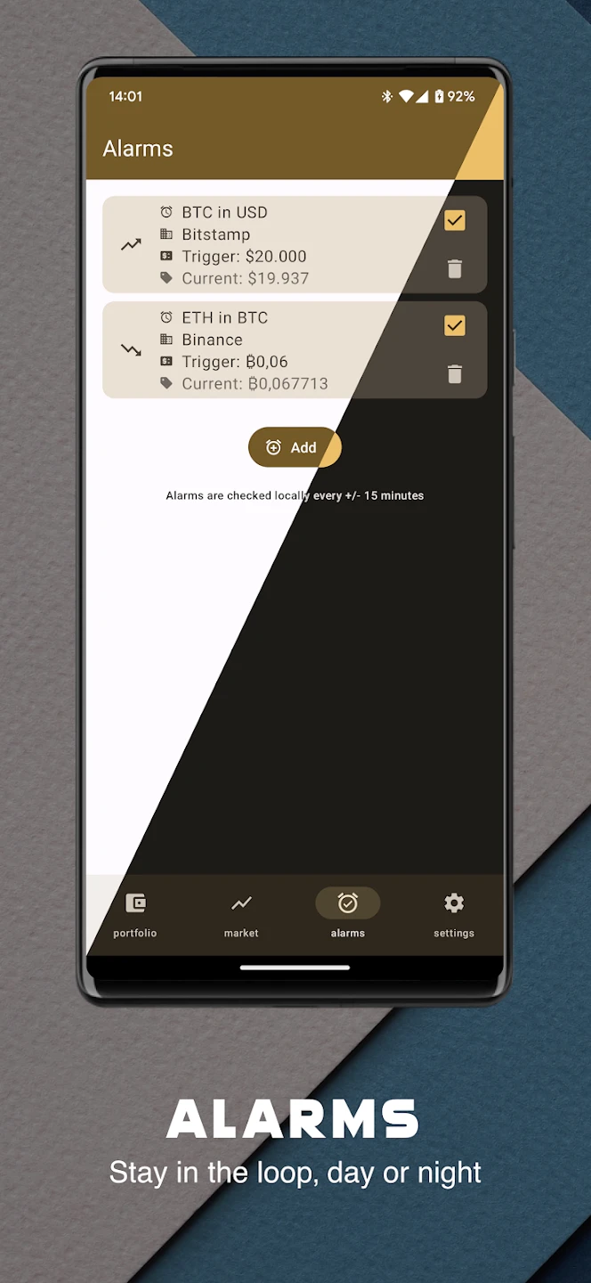- Portfolio Tracker: Create and manage personal crypto portfolios with automatic value calculations in USD/EUR/BTC. The feature includes visual performance reports, spending breakdowns, and customizable alerts for price movements.