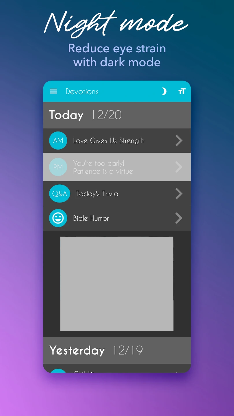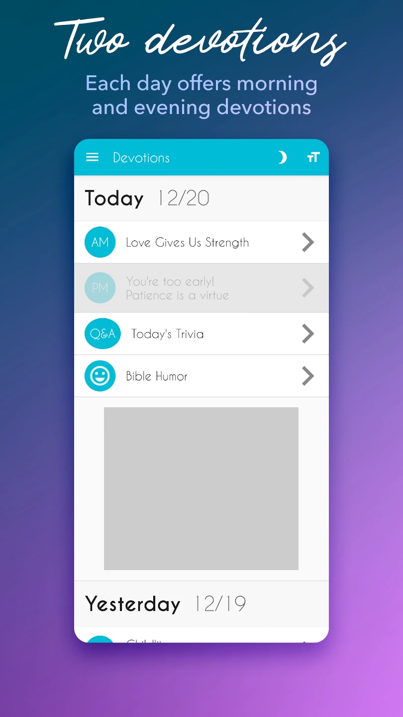 • Daily Reading Plan: Selects a random Bible verse each day, often with optional short reflections, helping users encounter God’s word regularly and unexpectedly, keeping the devotional content fresh and engaging without needing manual input.