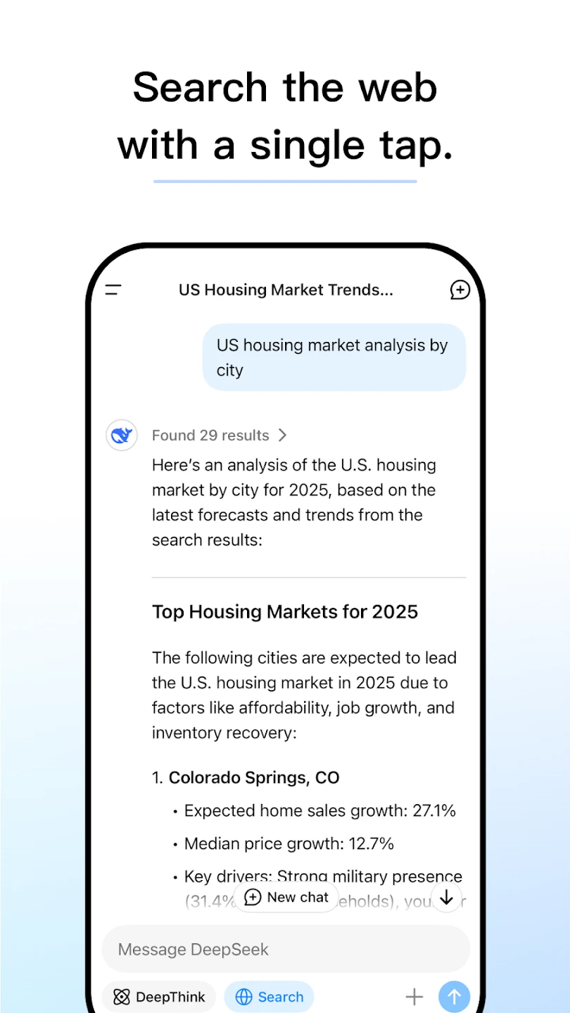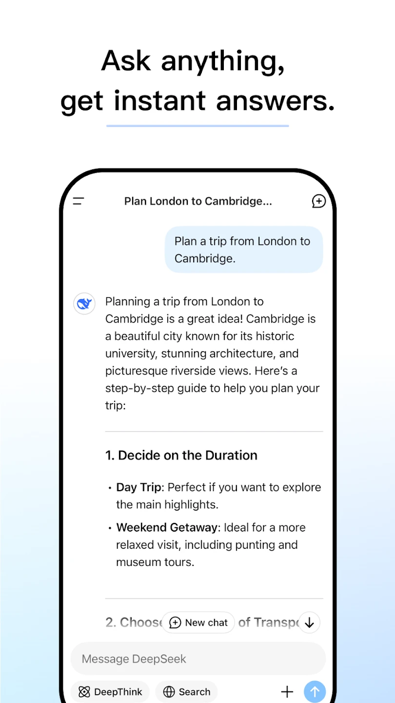 A: Unlike Google, which offers lists or links to answers stored elsewhere online, DeepSeek – AI Assistant generates direct responses inside the app. It understands the context of your entire conversation and doesn’t offer search snippets, making the interaction more direct and interactive rather than consultative.