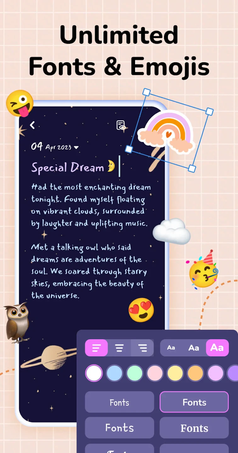 • Rich Text Entry with Formatting: Create beautifully formatted journal entries complete with bold text, bullet points, and color customization. This enhances the expressive experience, allowing for visually distinct entries that mirror handwritten styles while preserving content privacy.