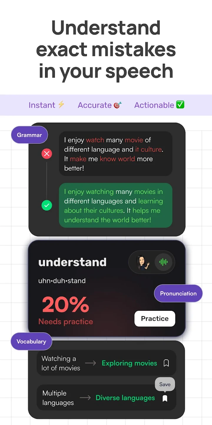 Designated for offline progress and real-time transcription/feedback provision. Known for its emphasis on standard accent alignment. |
