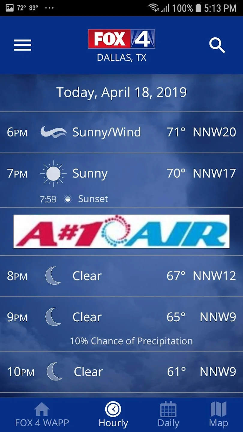 • Real-Time Forecast: Get detailed, localized weather predictions including temperature, chance of precipitation, humidity, wind speed, and conditions hour-by-hour or day-by-day for your specific location within DFW. This helps you plan your day effectively, knowing what to expect right where you are.