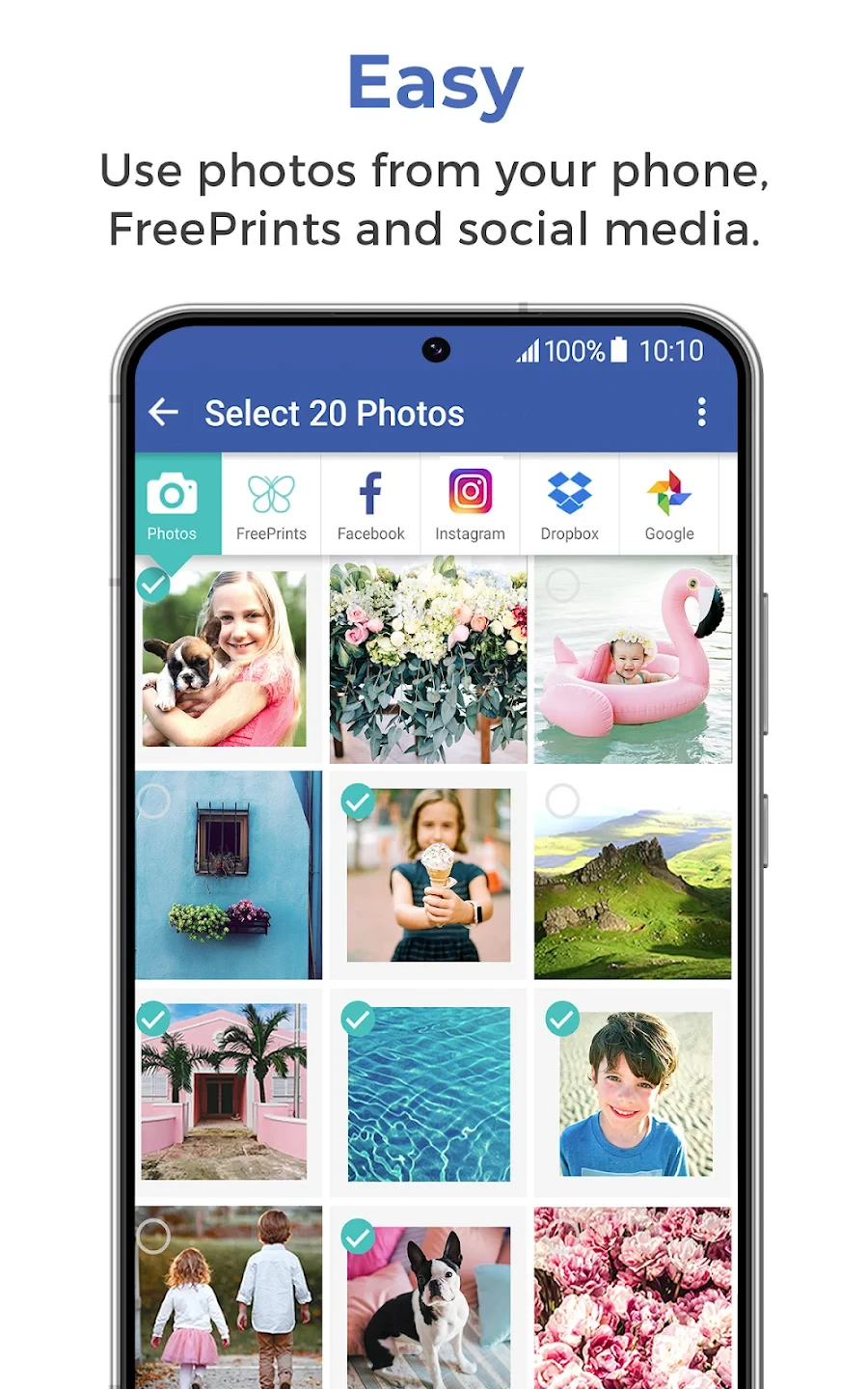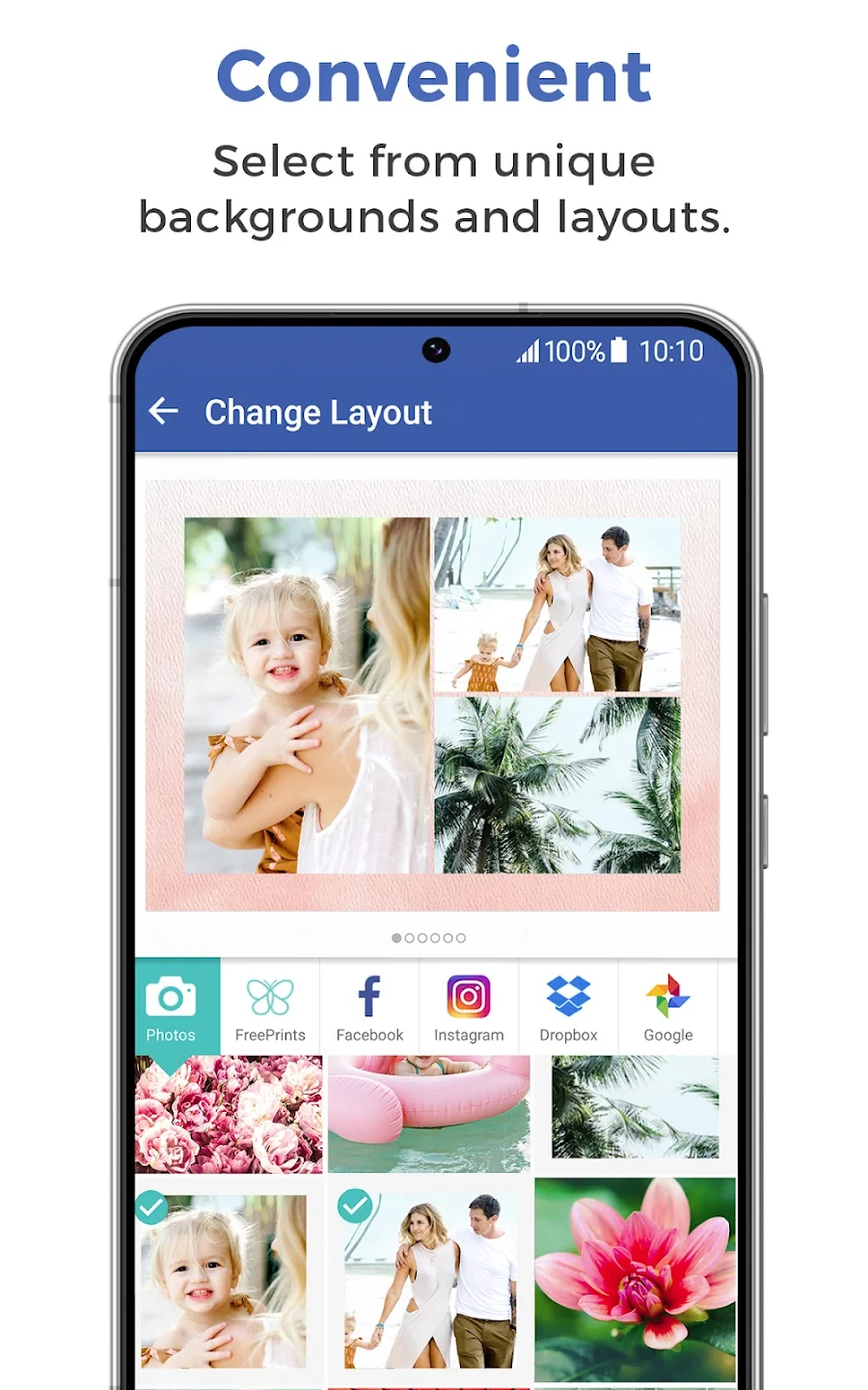 A: Yes, FreePrints allows bulk imports from various sources including email attachments, cloud storage (Google Drive, iCloud), and social media platforms. The app automatically categorizes duplicates and suggests optimal layouts, saving you significant editing time.