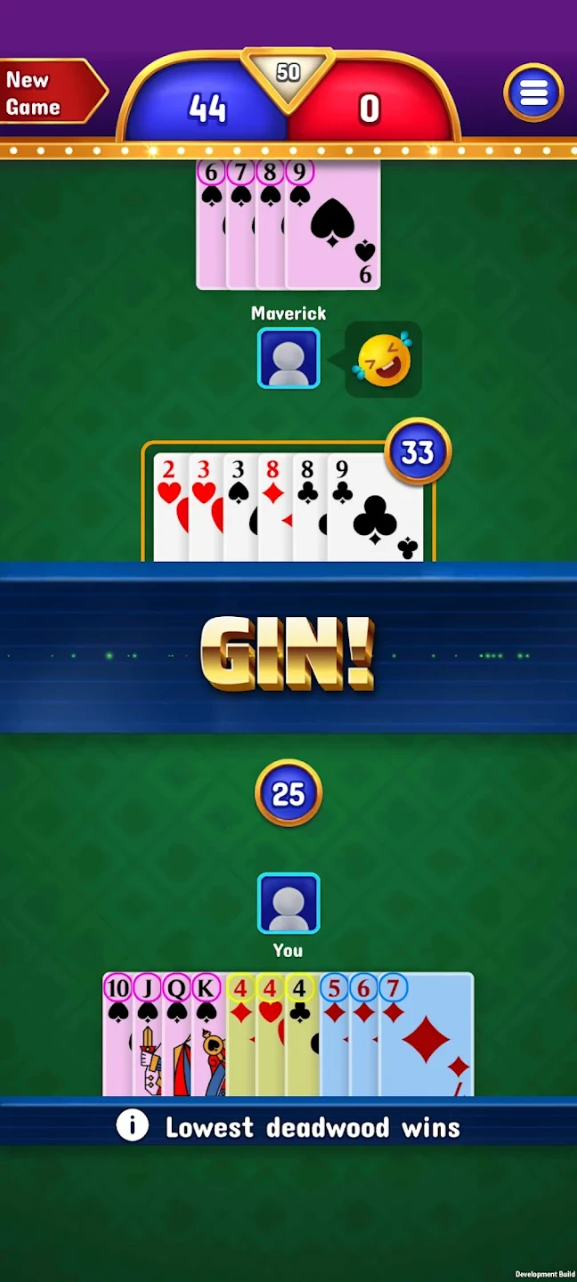 • [Core Gameplay Loop]: Players take turns drawing cards from a stock pile or the discard pile and discarding one card per turn. The primary objective is to form three or four sets (three cards of the same rank) and runs (successively ranked cards of the same suit). A player scores by discarding a card called “Lawn Gin” (or “Gin”), which means having a hand where the total value of unmatched cards is 10 points or less. Interaction is centered around strategic card selection and observation of discarded cards from opponents.
