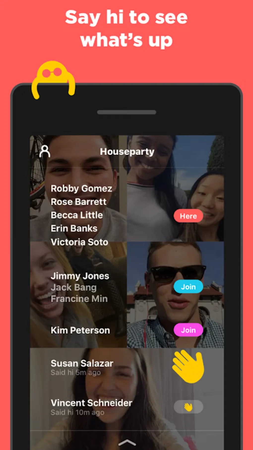 - Party Moderation Tools: As an organizer, you can manage participants by muting or removing others, ensuring comfortable and safe social interactions in group settings.This feature provides peace of mind during large gatherings, making Houseparty suitable for both small groups and larger events.