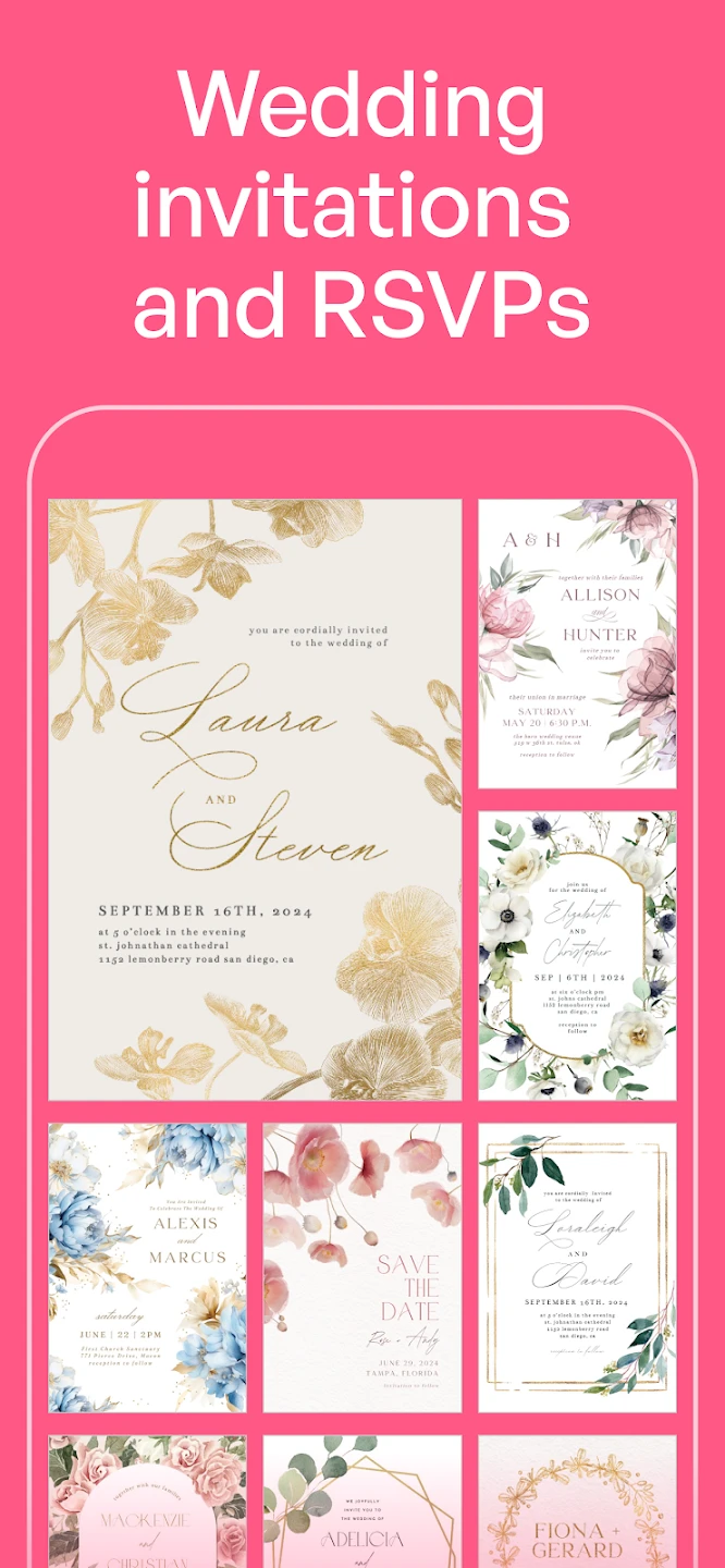 - Email/Calendar Integration: Directly schedule emails with embedded invitation links and add RSVP cards to your personal or guests’ calendars with a single tap. This feature enhances guest engagement by providing convenient sharing options and simplifies your event planning workflow significantly.