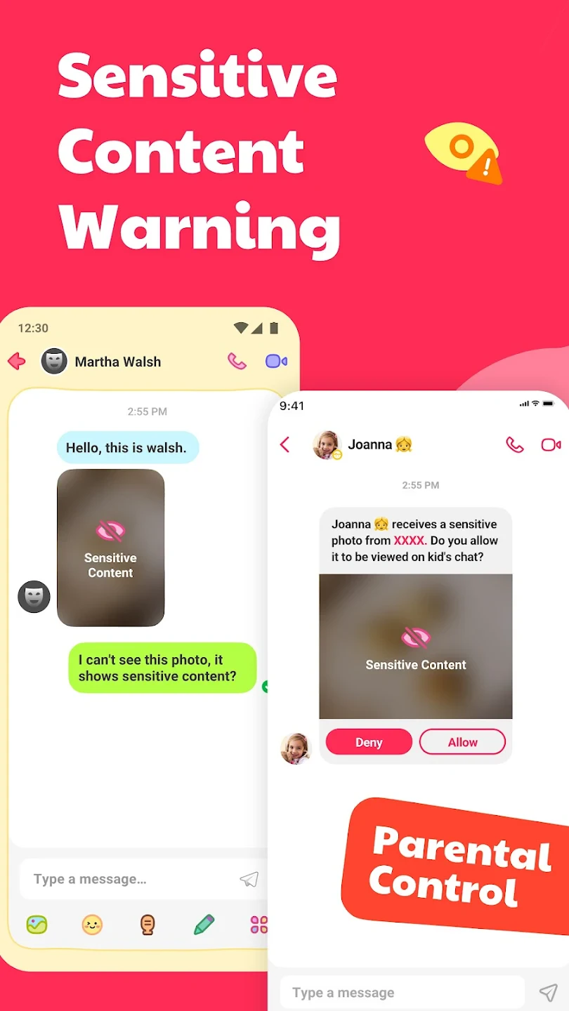 - Smart Content Filtering: The app automatically filters inappropriate language and media, preventing harmful content from reaching children during messaging, video calls, or file sharing sessions.