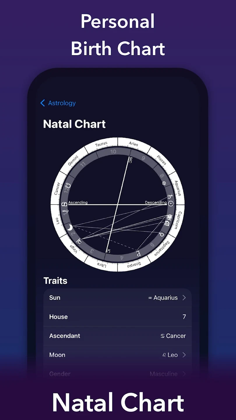 A: Yes, the app allows you to view your detailed birth chart, including planetary positions, and offers insights into transits and progressions, helping you track how cosmic energies impact your life over different periods.