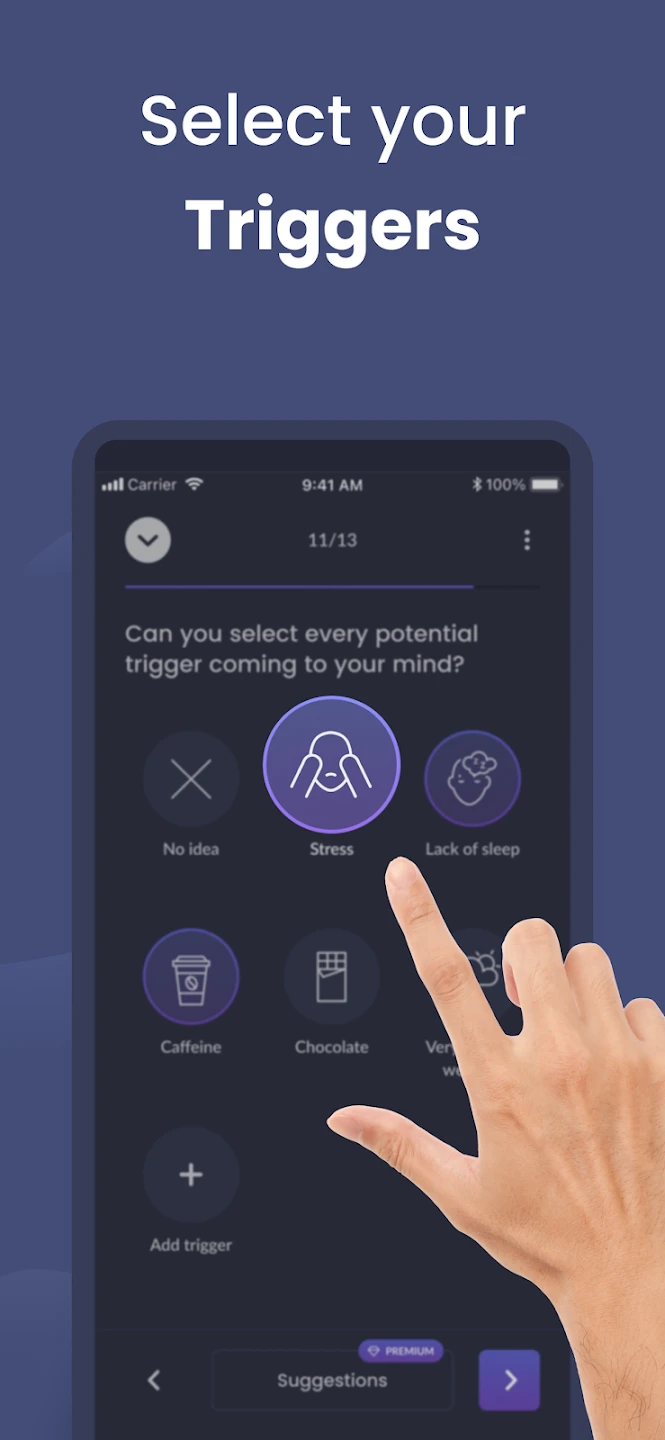 - Interactive Trigger Identification & Categorization: The app seamlessly categorizes symptoms like nausea, sensitivity to light or sound, pre-headache warnings (prodrome), and aura. Utilizing built-in triggers (lack of sleep, stress, weather changes, diet, etc.) helps identify patterns specific to you; users can then add custom personal triggers observed, making the analysis surprisingly visual and revealing correlations users might otherwise miss.