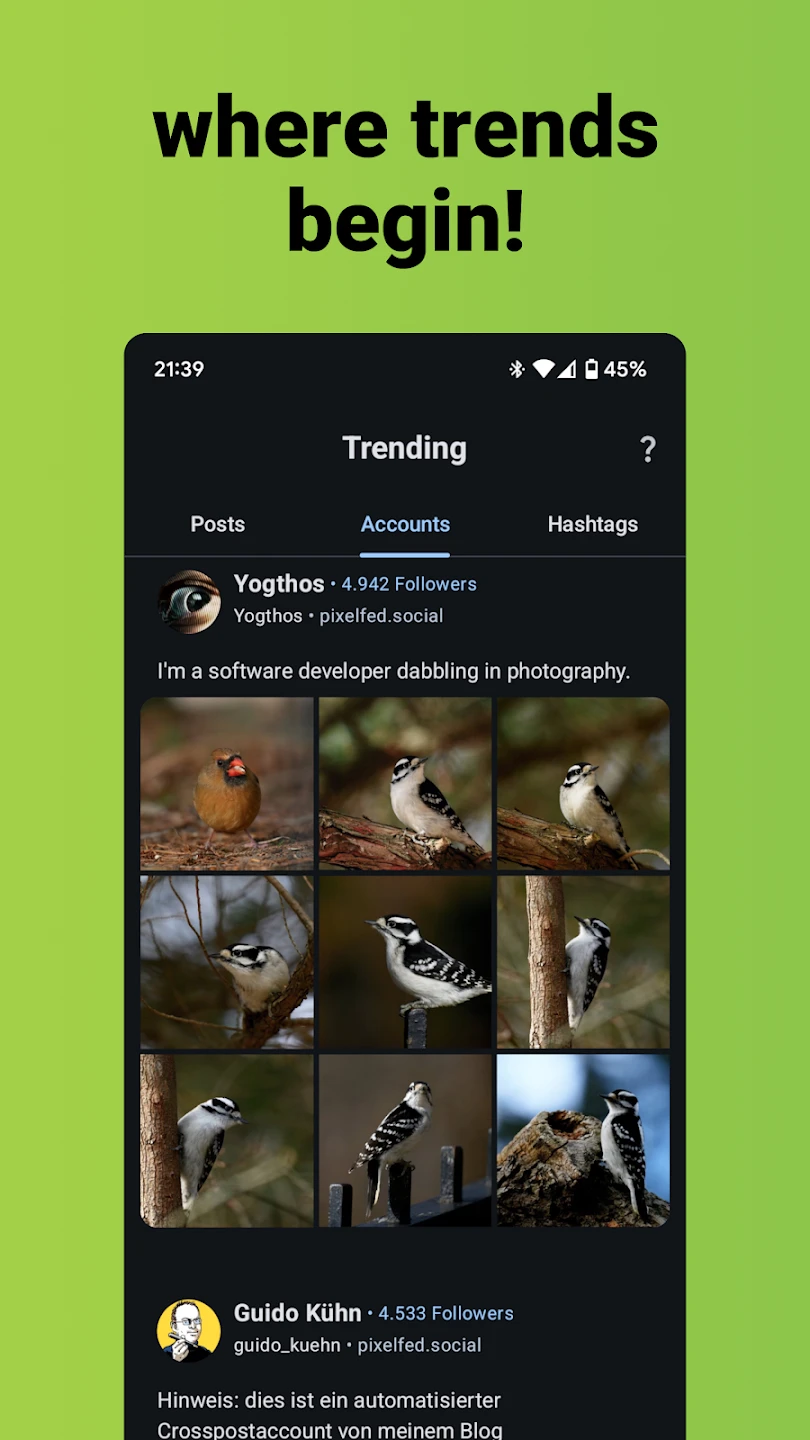A: The app includes a search function that looks across connected instances. You can search for users by username or explore suggested accounts based on your interests, or discover trending accounts in specific niches directly within the app’s navigation.