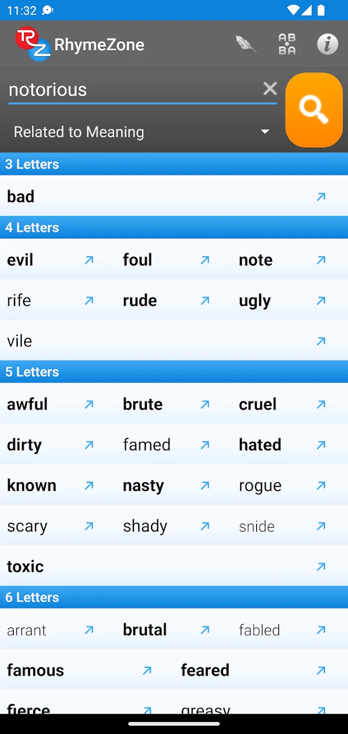 - Phrase Entry & Sound-alike Search: Start typing a phrase or word into the search bar, and the app instantly finds words that sound similar to the entire input. This feature is incredibly useful for poets crafting complex rhymes or musicians finding the perfect lyrical match quickly, allowing for much faster creative discovery than trying to guess rhymes manually.