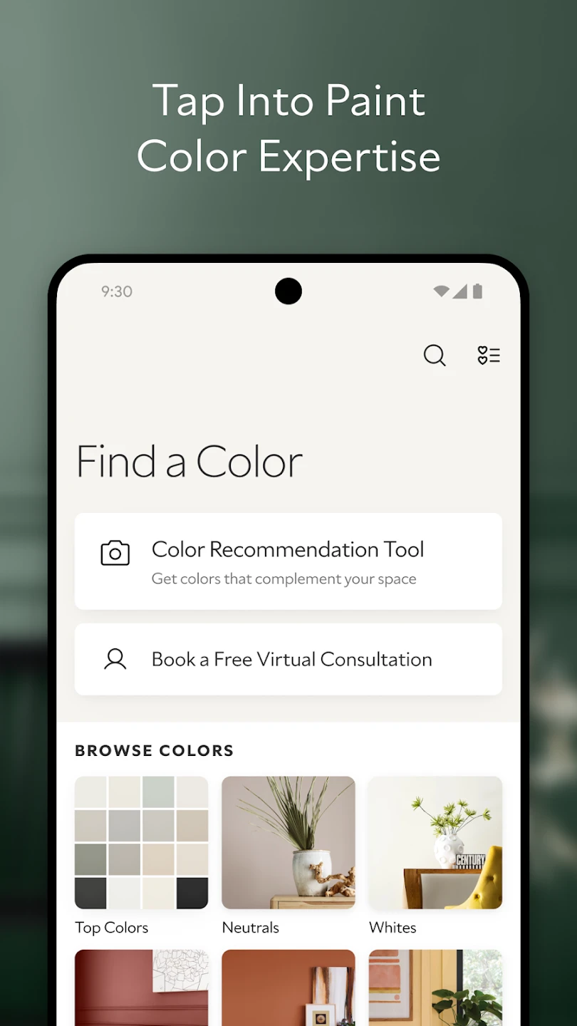 • Comprehensive Color Library: Access thousands of paint colors organized by collections, trends, or room mood directly within the app. This feature provides unparalleled inspiration and ensures you choose the right Sherwin-Williams Color Expert™ color for your specific project, interior design, or exterior application.