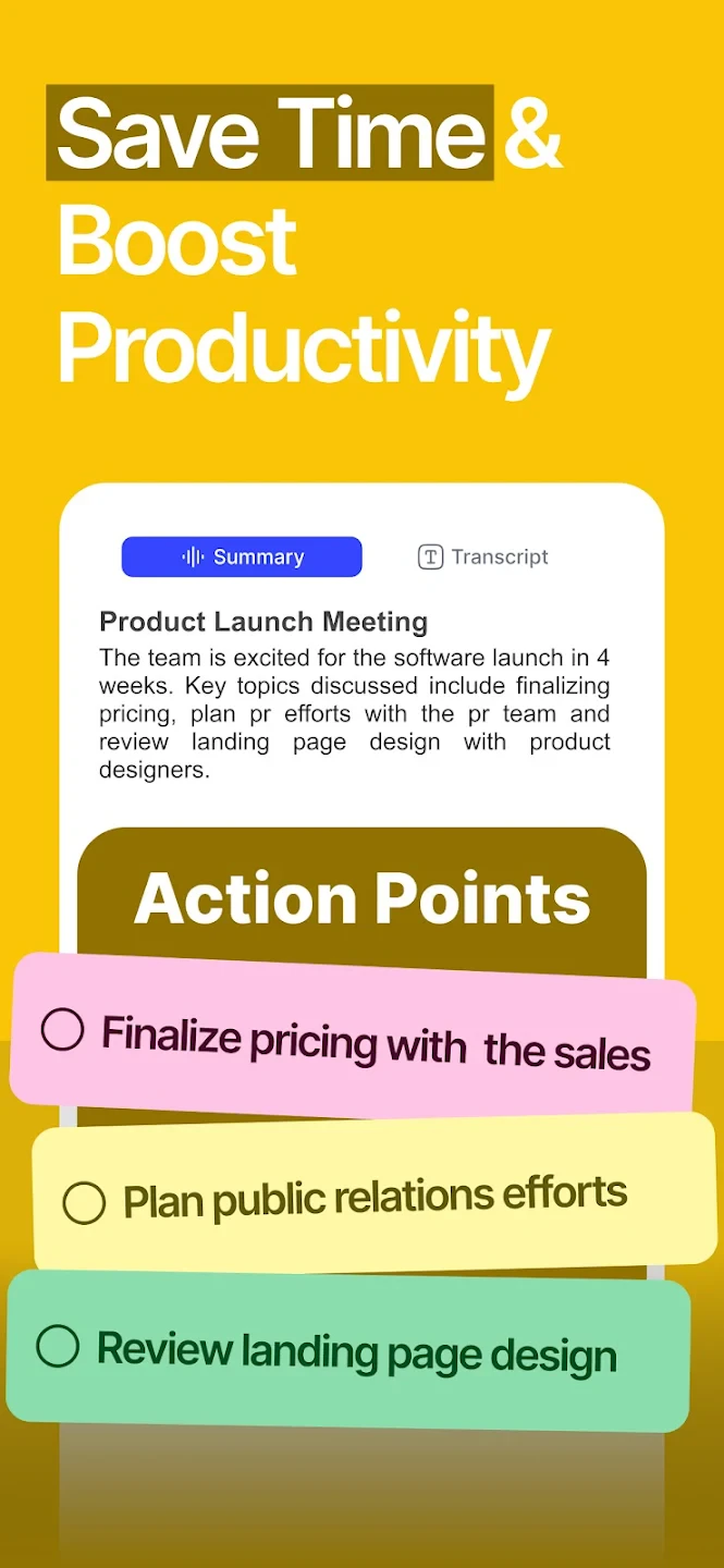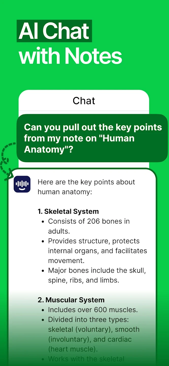 • AI Summarization & Key-Point Extraction: Automatically analyzes your notes to identify main ideas, create concise summaries, and highlight critical details like action items or dates, using natural language processing to understand context and deliver relevant content. Imagine finishing a long conference call with an automatically generated summary highlighting decisions made and tasks assigned.