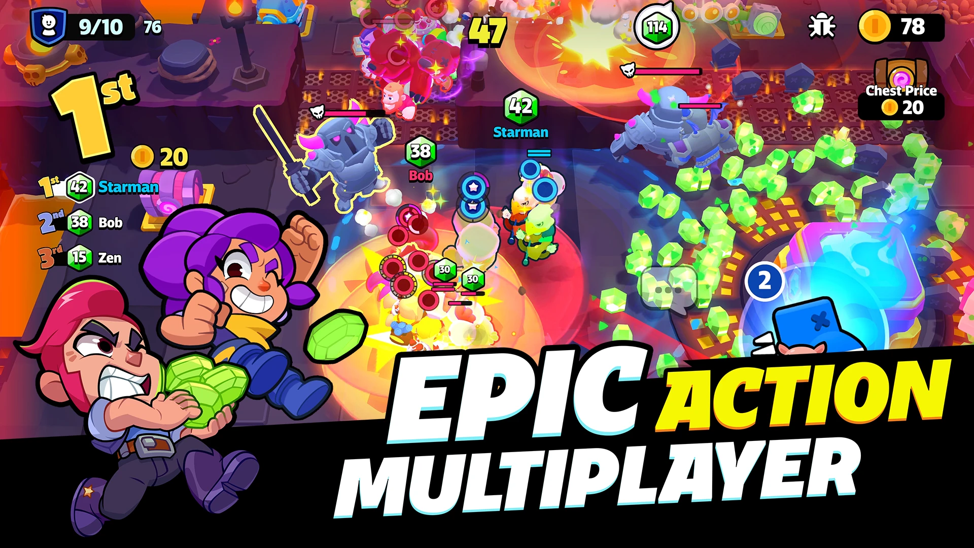 - [Modes or Levels]: Squad Busters primarily offers endless survival modes with randomly generated levels for maximum replayability. Players can unlock various characters, each with unique abilities and weapons. Progression is tracked with high scores, while collecting coins unlocks new characters and cosmetic items for customization.