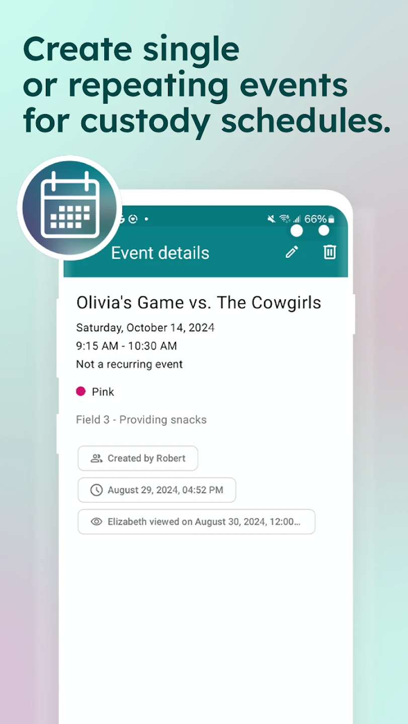 - Smart Calendar Synchronization: Automatically sync visitation schedules, school holidays, and events across both parent profiles. The system flags upcoming deadlines like custody changes or court dates, improving reliability and preventing missed appointments.