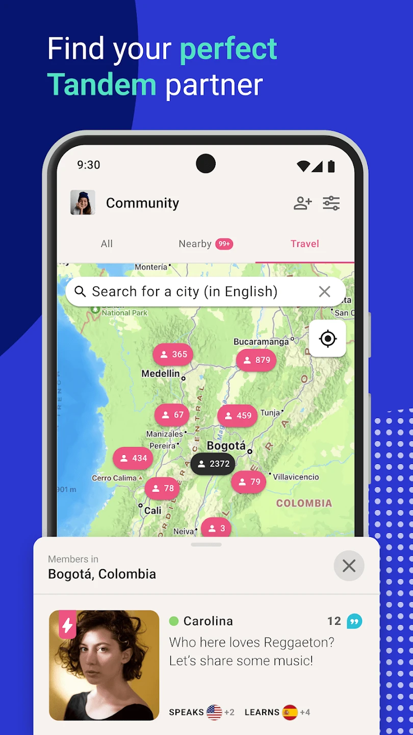 • Language Pair Matching: Tandem utilizes sophisticated algorithms to pair learners with native speakers based on shared language needs and mutual interest within a 15-mile radius. Native speakers benefit from teaching opportunities tailored to their linguistic strengths, while learners receive focused practice in their target language, functioning like a decentralized tutoring system.