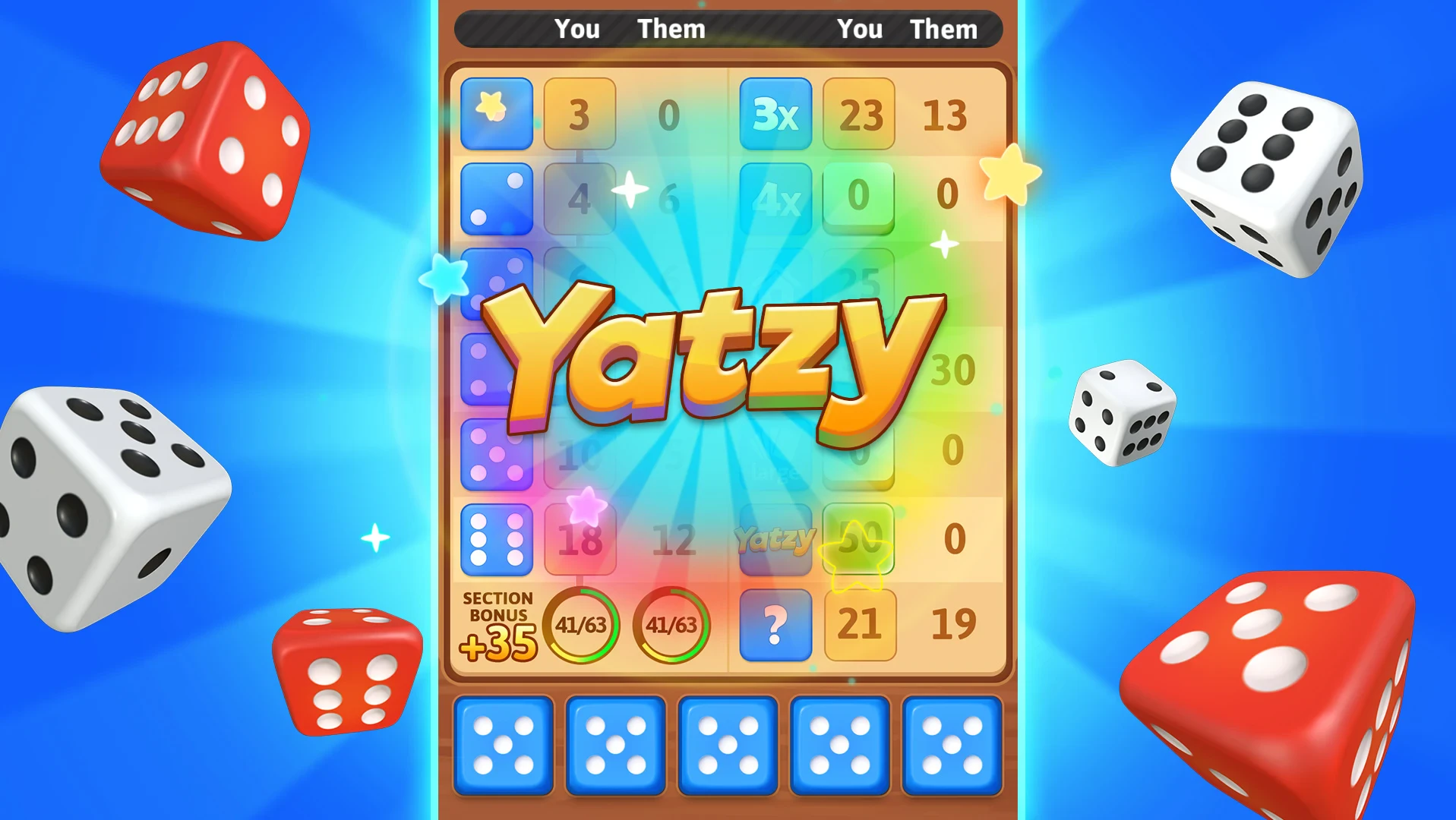 - [Modes or Levels]: Yatzy Blitz offers several engaging modes, including single-player versus AI opponents, local multiplayer for playing with friends on the same device, competitive online multiplayer modes, and various themed challenge modes. The game provides hundreds of rounds through its scoring combinations, ensuring significant replay value.